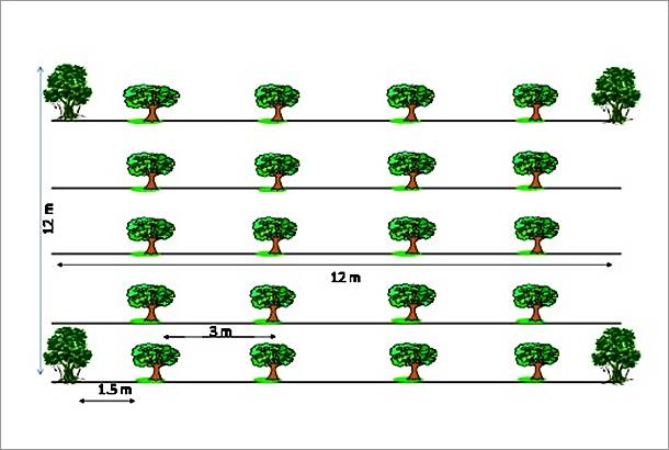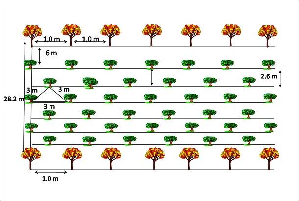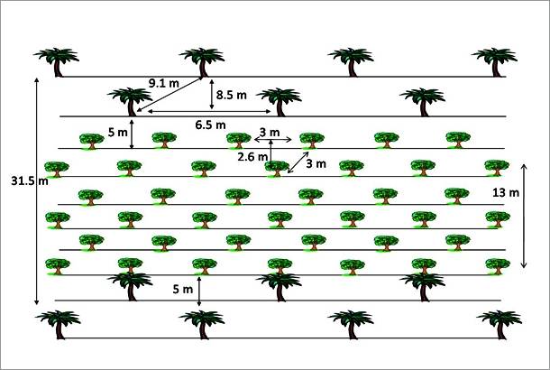 Tanaman durian ditanam sebaris dengan jarak antara barisan 23 m dan barisan 10 m Koko ditanam dengan 6 baris antara barisan durian. Jarak tanaman koko adalah 3 m segitiga sama dan jarak antara baris koko dengan baris durian ialah 5 m (Gambar 5.1).